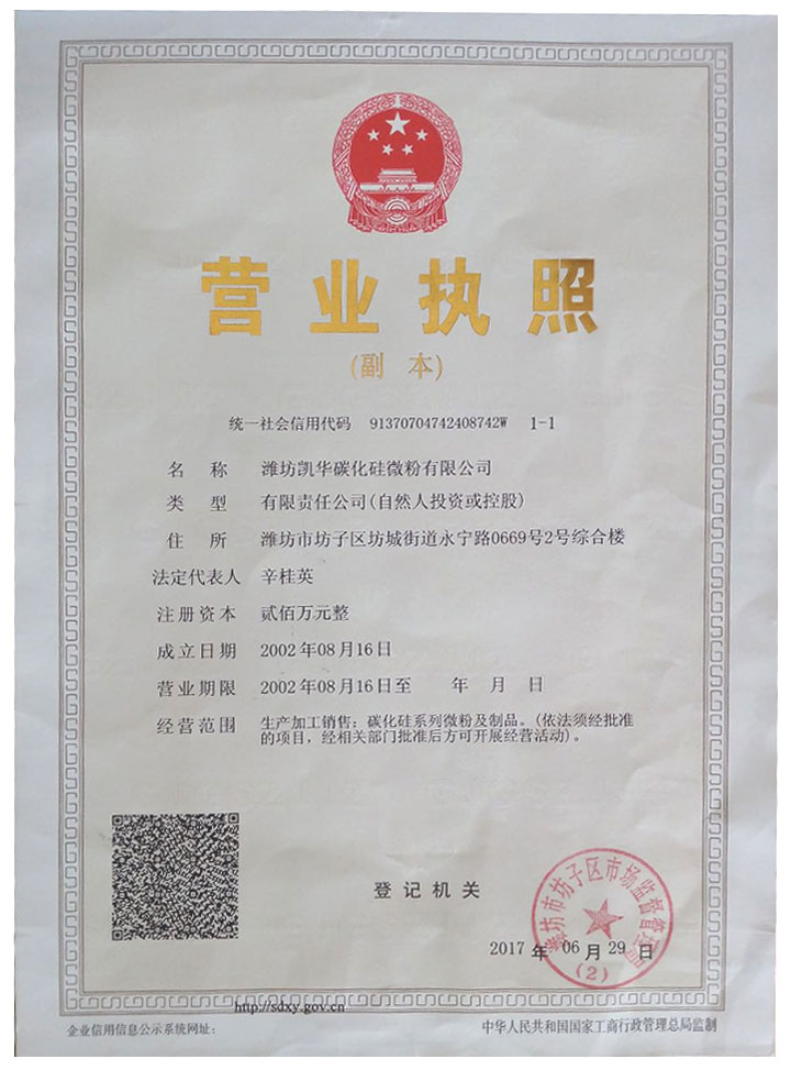 濰坊凱華碳化硅微粉有限公司成立于2002年,國(guó)家高新技術(shù)企業(yè),公司占地40畝,標(biāo)準(zhǔn)廠房19000平方,辦公樓、研發(fā)2000平方,年生產(chǎn)能力3萬(wàn)噸。一直從事陶瓷級(jí)微粉的生產(chǎn)銷售,所生產(chǎn)的微粉具有純度高、粒形好、穩(wěn)定性強(qiáng)等特點(diǎn),主要用于反應(yīng)燒結(jié)、無(wú)壓燒結(jié)、硅碳棒新工藝、汽車尾氣處理(DPF)、納米隔熱保溫、機(jī)車制動(dòng)、防腐涂料、研磨拋光、橡膠樹(shù)脂等領(lǐng)域。標(biāo)準(zhǔn)產(chǎn)品有:F240、F1200、W40、W28、W20、W14、W10、W7、W5、W3.5、W2.5、W2、W1.5、W1、W0.5、D3E、5S、100F及整形高密度系列綠碳化硅微粉,廣泛應(yīng)用于燒結(jié)、防腐、研磨拋光、涂腐等廣大領(lǐng)域。